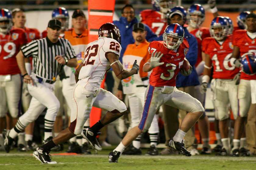 Kansas played in the Orange Bowl against the ACC Champion, the Virginia Tech Hokies. The game was a classic that including a Hokie punt return touchdown (big surprise there) and an Aqib Talib pick six. The Jayhawks came out on top in Miami, 24-21. Coach Mangino’s squad placed 7th in the AP after their 12-1 finish to 2007.